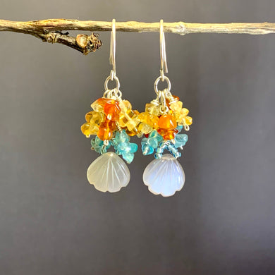 Moonstone Shell Earrings. Gemstone Cluster Earrings. Handmade Dangle Earrings. CVAG