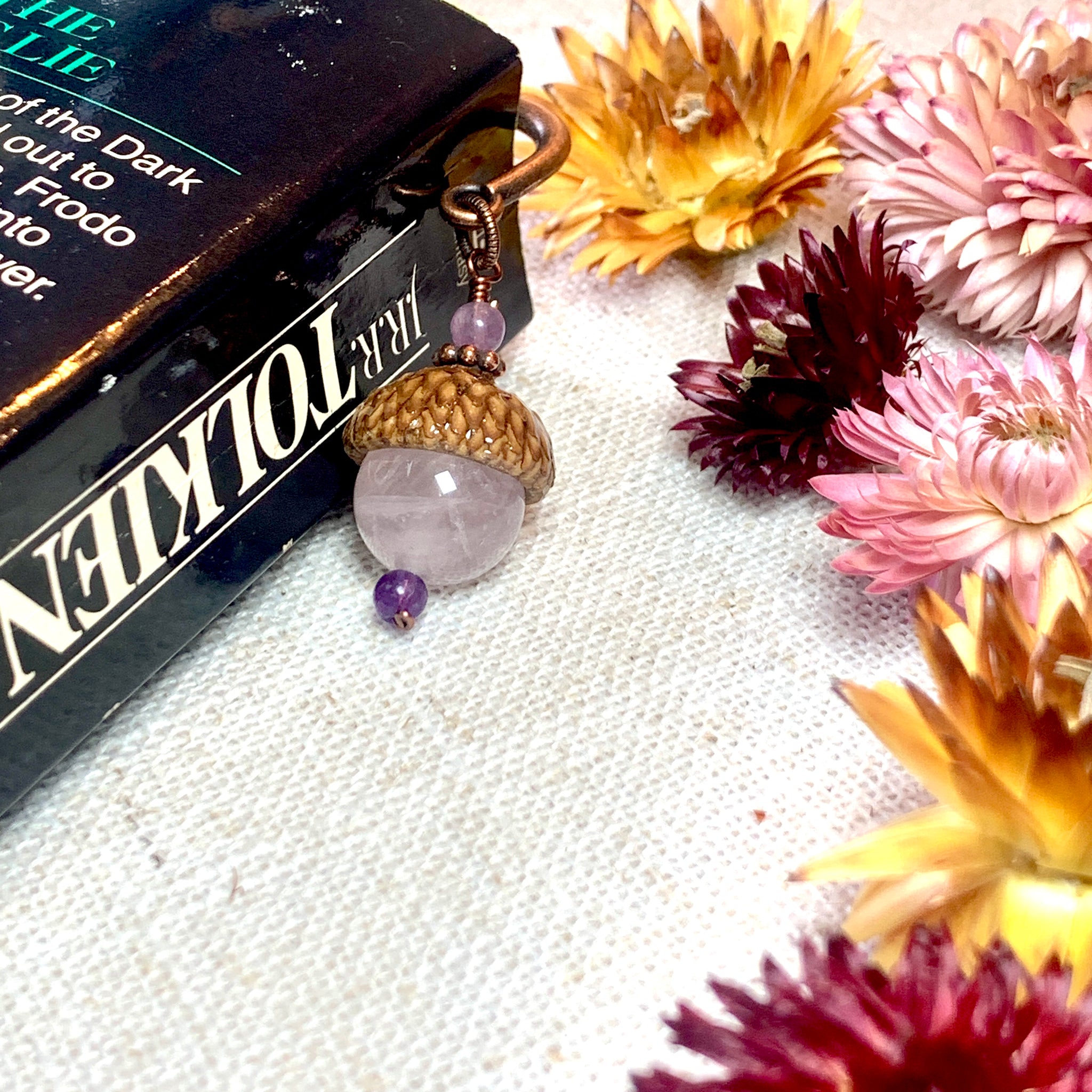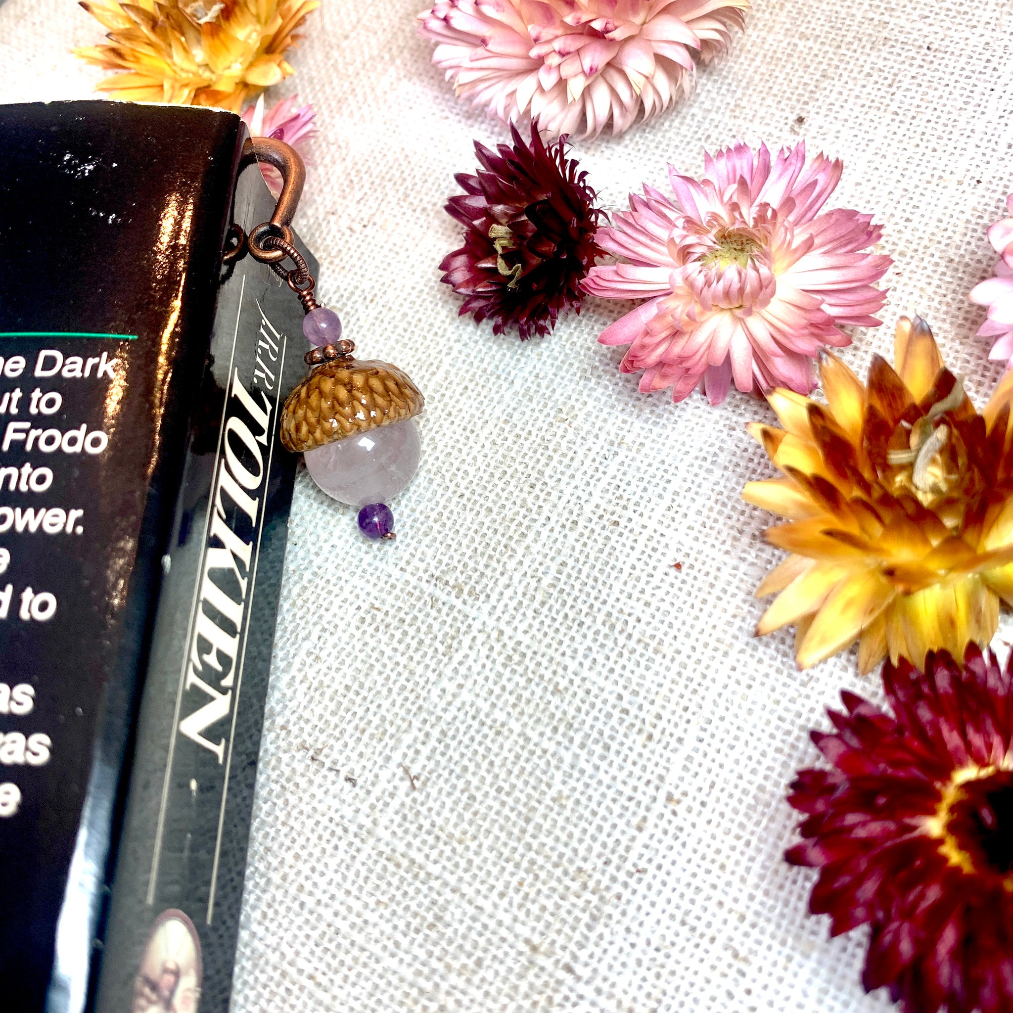 Sometimes you just gotta take a break from reading that book and you need a perfect little something to hold your place. Yes, a receipt from your purse will do the job but wouldn’t you rather have a copper feather slide into your book with a glowy pink acorn gem draping down the spine and calling you back to the imaginary world between those pages?