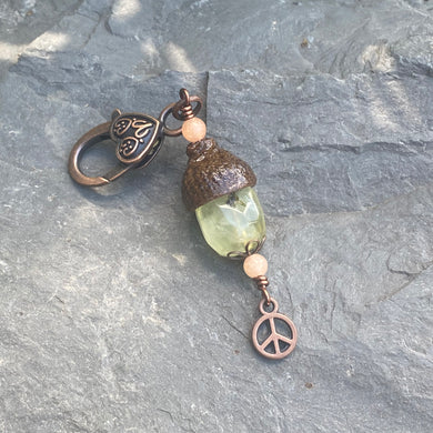 Lime Quartz Acorn Charm with Copper Peace Sign