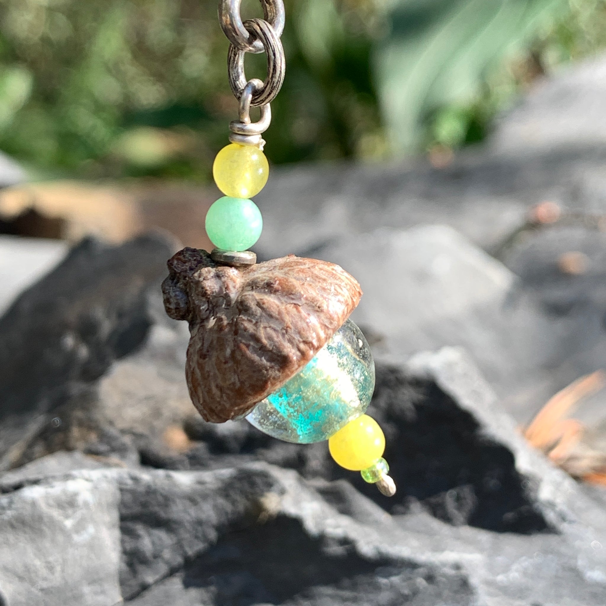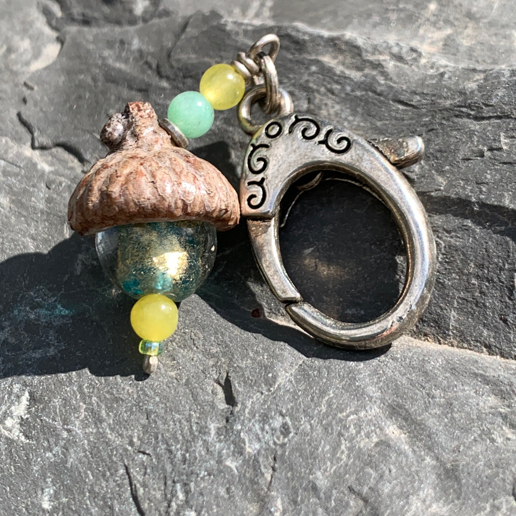 My signature fantasy gemstone acorns made into durable keyrings and zipper pulls. They are cute, colorful and each one is totally unique. I make these from acorns harvested in my own forest and think of them as little fantasy colorful gem acorns. Perfect for everyone. I have masculine and feminine styles, lots of colors and both small and large options. I make styles in Gold, Silver and Copper metal colors. The clasps are strong. The stones are wired in (not glued) for strength and will last even with lots of use. The acorn caps are resin coated and will survive lots of bumps, drops and life....
