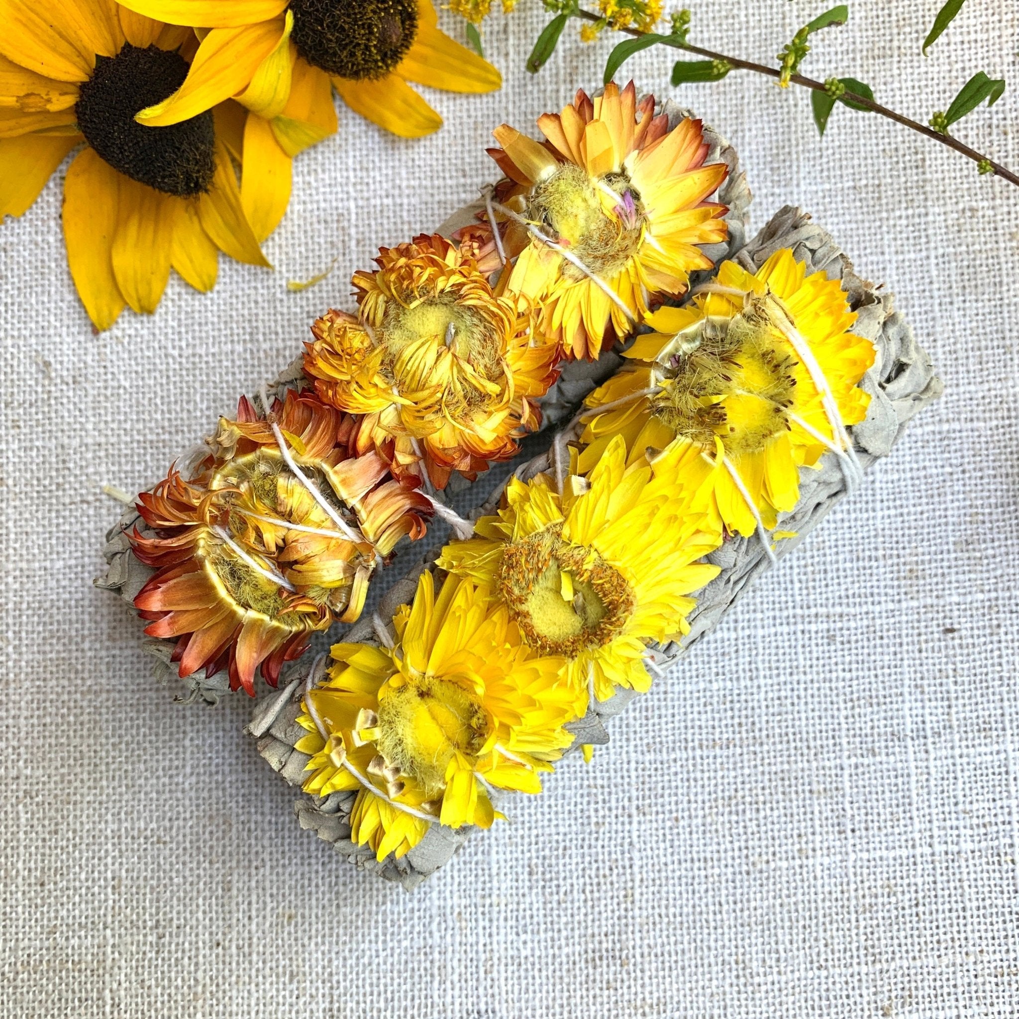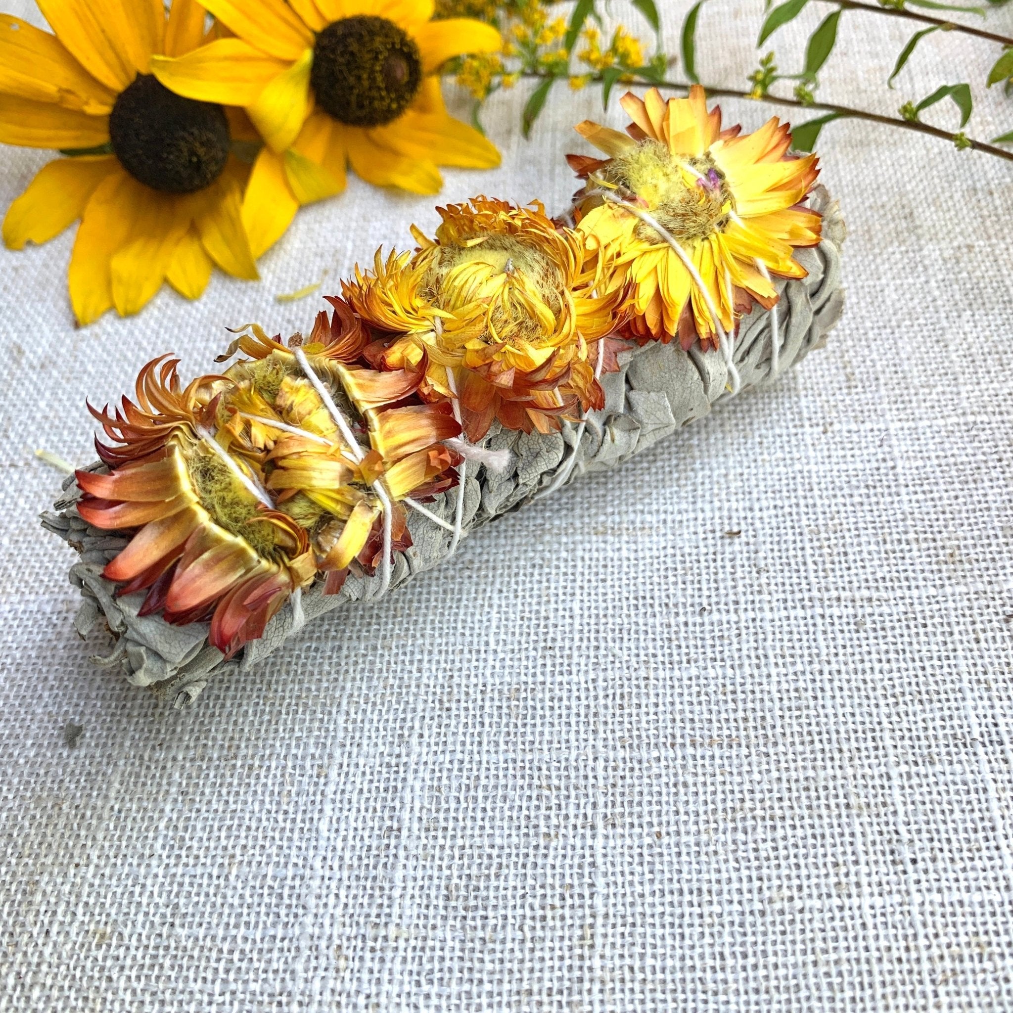 4” white sage incense wand with sunflowers. The smudge stick is handmade and very fragrant.